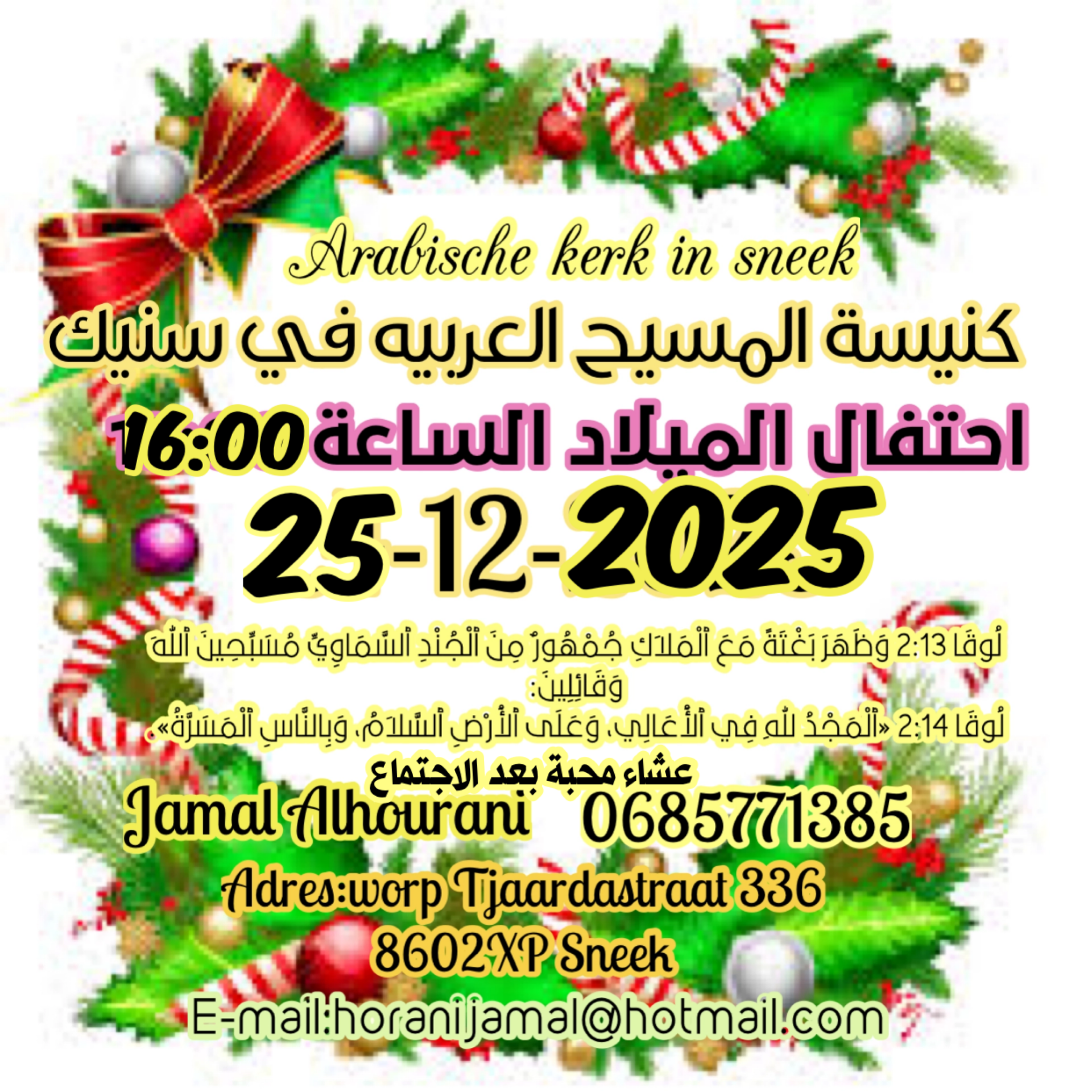 De Arabische Kerk van Christus in de stad Sneek in Friesland werkt sinds 2018 in evangelisch-christelijke spirituele bijeenkomsten. Wij zijn gespecialiseerd in het onderwijzen van de Bijbel met Arabische en Nederlandse dienaren. Het vermogen om vanuit het Engels en Nederlands naar het Arabisch te vertalen. Er zijn spirituele boeken in de Arabische taal. Ook zijn er spirituele conferenties. We nemen met Nederlandse kerken deel aan hun bijeenkomsten in de taal. Nederlands, en er zijn educatieve lessen voor hen die zich willen laten dopen en lid willen worden van de Arabische kerk in Sneek, en we hebben een lofprijsteam voor aanbidding in de kerk, evenals speciaal onderwijs voor kinderen